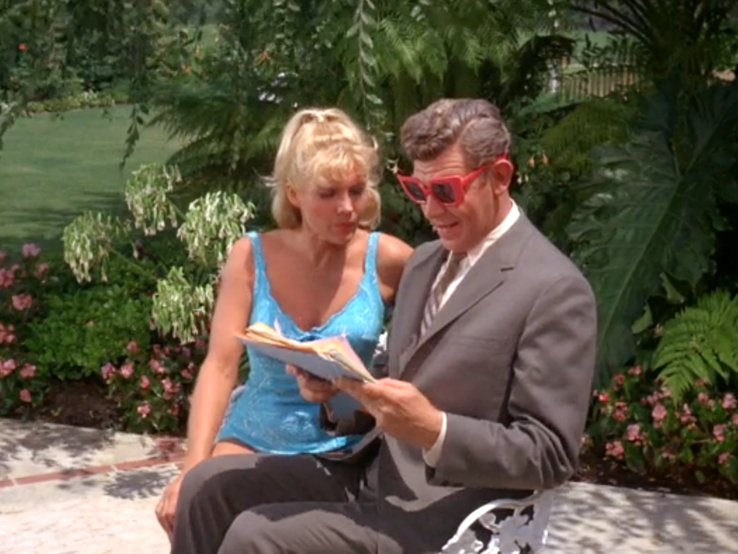 Andy arrives at Lee's home and is met by a housekeeper. The housekeeper directs him to the back, where Lee is sunbathing near her swimming pool. Andy is instantly smitten by the attractive Miss Drake, unaware that she is the lawyer he is to meet with. She introduces herself much to his embarrassment. Andy is reluctant to sit near Lee while tending to work, fearing he will succumb to temptation and prove himself unfaithful to Helen. As Lee excuses herself for a swim, Andy cannot keep his eyes off her. Subsequently, he acquires a severe sunburn while discussing the case.