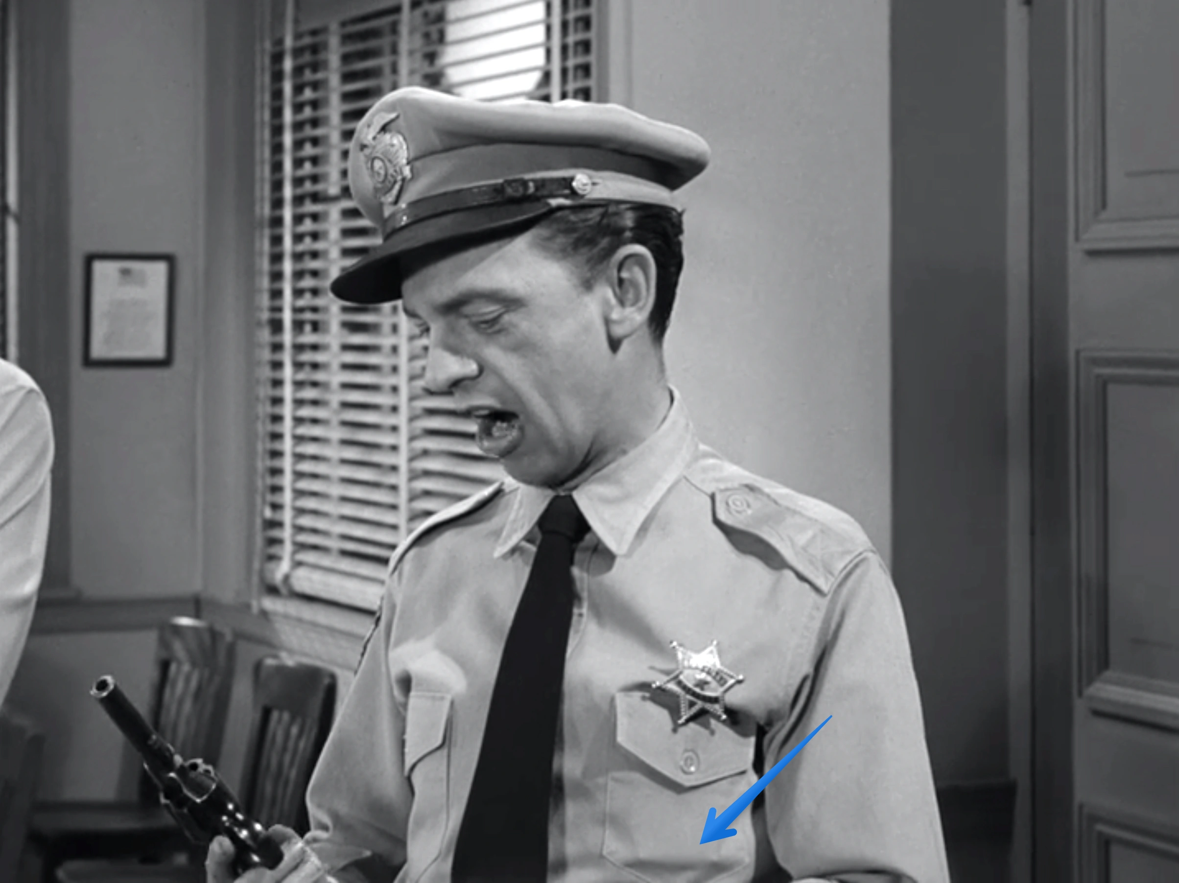 * In the scene where Barney's gun goes off as he is talking to the newly sworn deputies, you can see the outline of his one special bullet in his shirt pocket. Extra bullet put in the gun for the laugh.