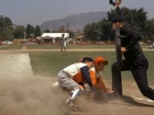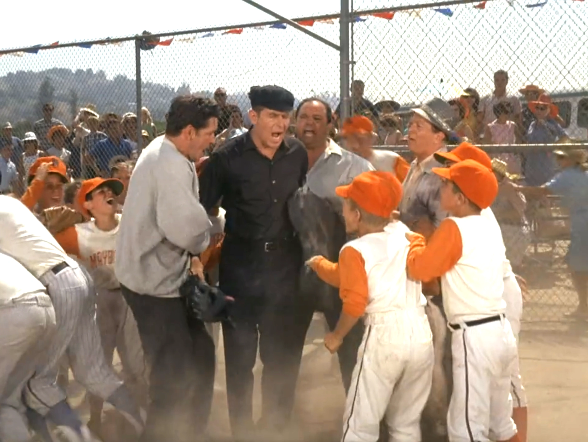 Goober is addressing the team giving them a big pep-talk right before they take the field. In the background Mount Pilot is still on the field warming-up, taking fielding practice. The camera switches angles for a few seconds then switches back showing Mayberry taking the field. The Mount Pilot team has disappeared completely in the matter of a few seconds ...no wonder they won with speedy players like that.