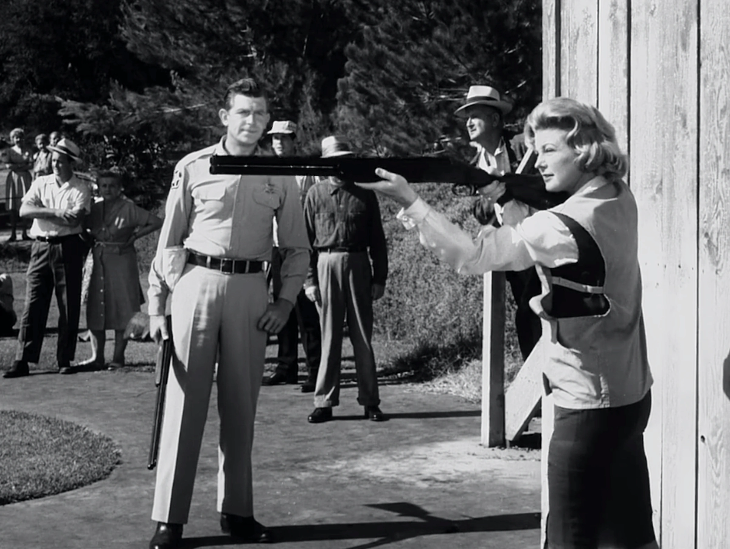 - Gail Davis, who plays Karen Moore, was actually an expert trick shot artist off-screen, which she displays during the skeet shooting competition in this episode